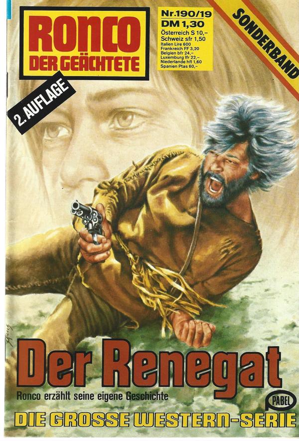 Ronco der Geächtete Sonderband Nr. 190/19Der Renegat.Ronco erzählt seine eigene Geschichte.von: John GreyVerlag: Erich Pabel Verlag, RastattRomanheft 64 SeitenFormat: 15,5 x 22 cmZustand: sehr gut