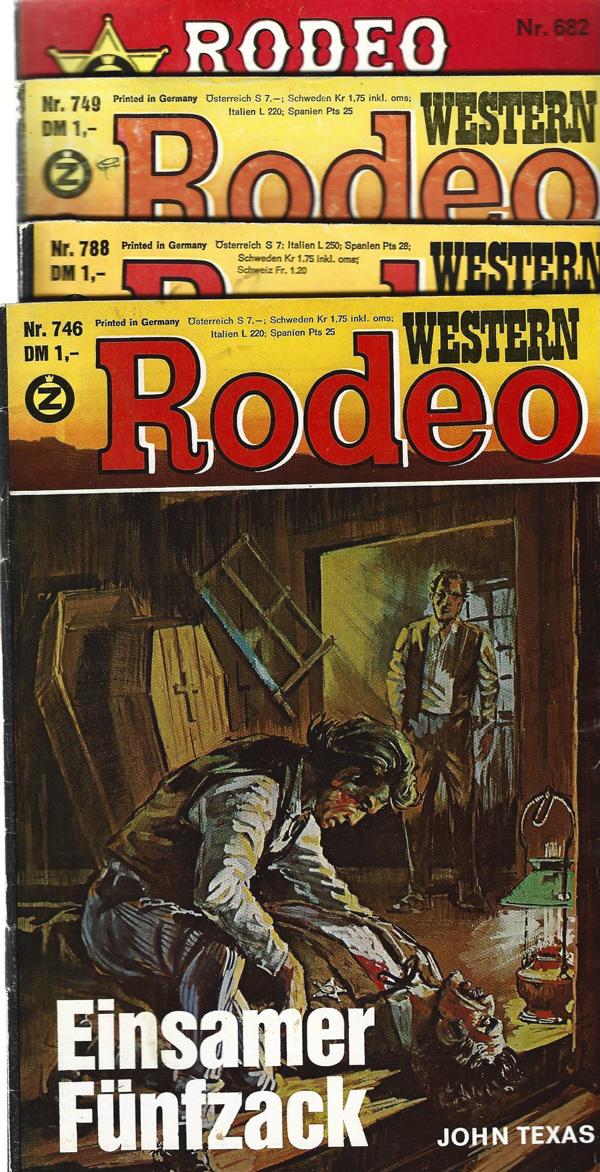Nr. 746 Einsamer Fünfzack von John Texas Nr. 749 Reiter für Old Mack. Rock Drewell Story I von Ward Bros. Nr. 788 Danas letztes Spiel von H.S. Sharon Nr. 682 Der schwarze mit dem schnellen Eisen von Ward Bros.