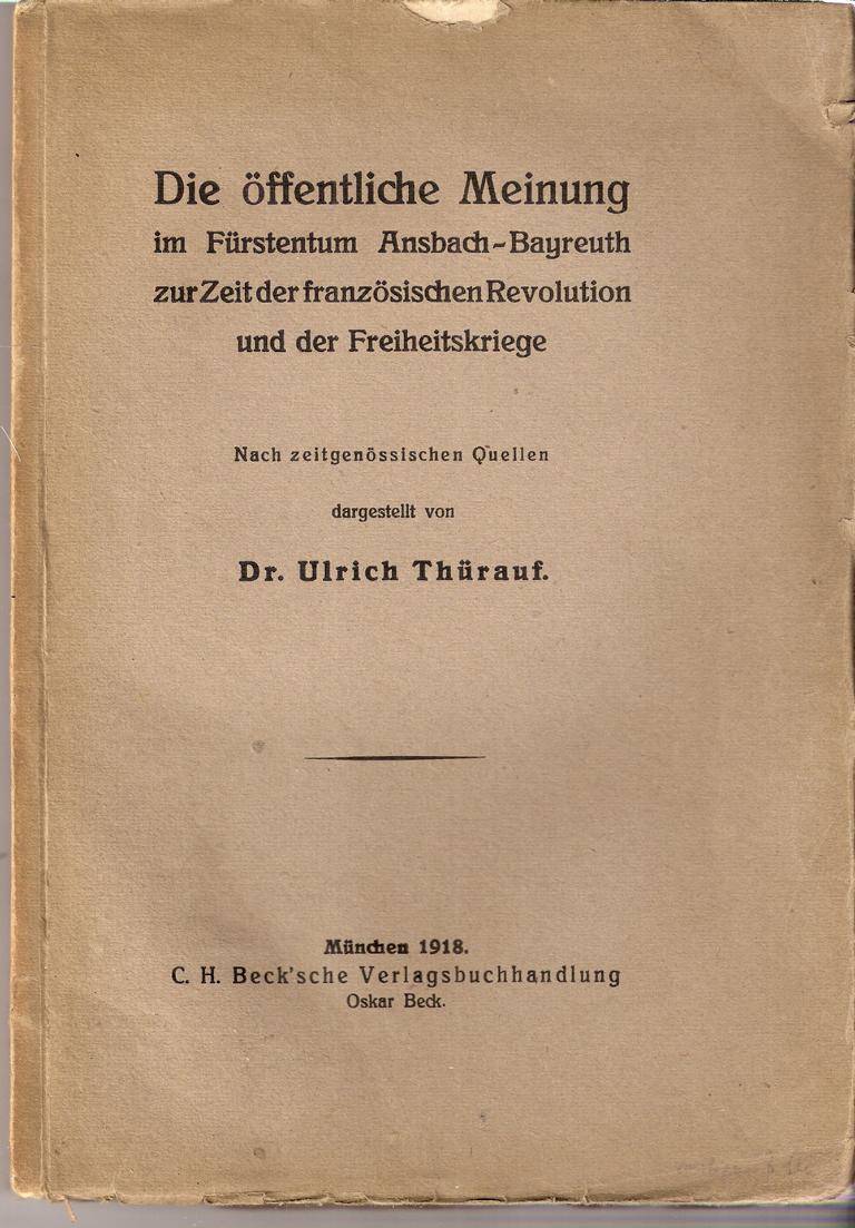 Die öffentliche Meinung im Fürstentum Ansbach-Bayreuth zur Zeit der französischenRevolution und der Freiheitskriegenach zeitgenössischen Quellen Autor: Dr. Ulrich ThüraufVerlag: Beck´sche Verlagsbuchhandlung München 1918Gebundenes Heft 151 Seiten Format: 16,5 cm x 24 cmGewicht: 283 gZustand: Papier nachgedunkelt,Buchschnitt angestaubt und noch nichtdurchtrennt, Buchdeckel (Papier) vornund hinten beschädigtWissenswert - Geschichte -
